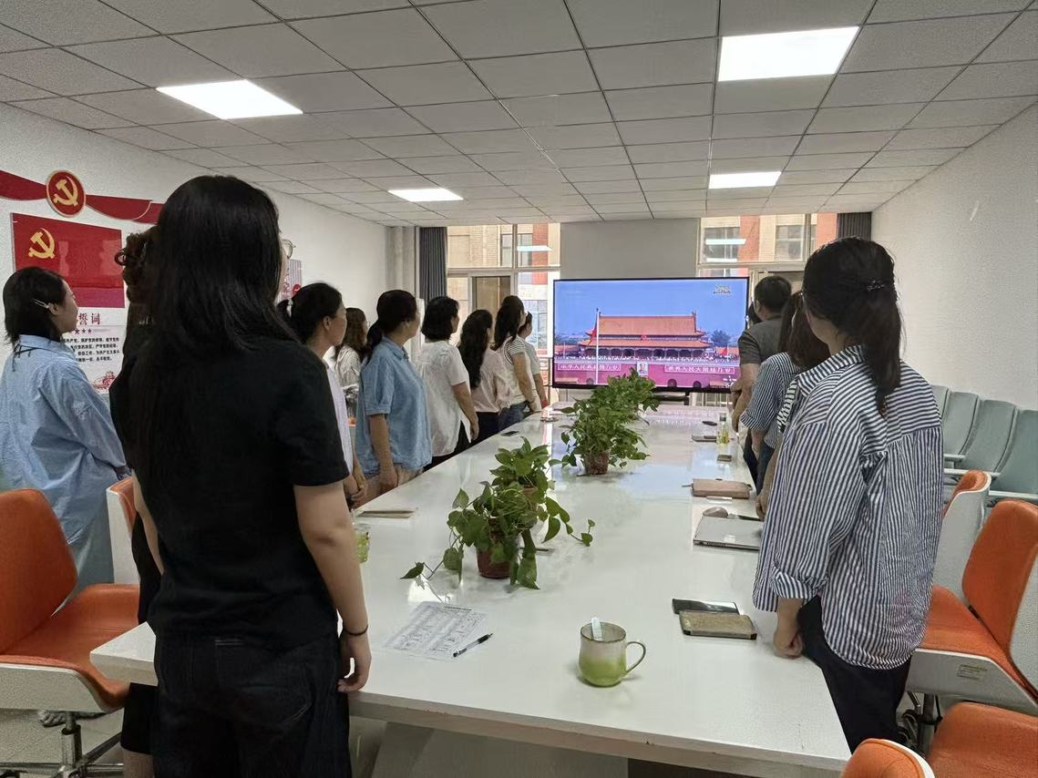 当雄壮的国歌奏响,鲜艳的五星红旗在屏幕中冉冉升起时,全体师生自觉起立,面向屏幕行注目礼,高唱国歌,嘹亮的歌声回荡在每个观看场所,爱国之情在这一刻凝聚升华。