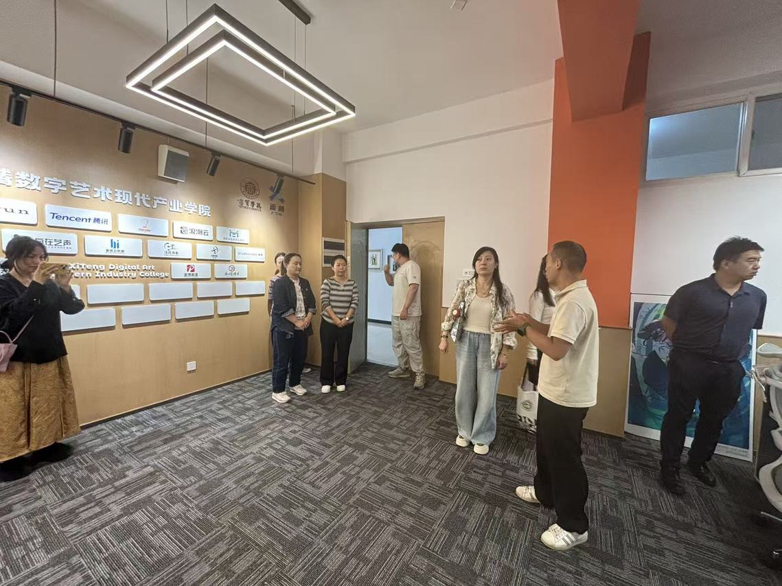 交流期间,双方围绕西腾数字艺术现代产业学院的课程体系、实践教学、校企合作等方面进行了广泛探讨。我集团产业学院作为校企合作的成功典范,通过引入企业真实项目和行业标准,致力于培养符合市场需求的高素质艺术人才,其经验为人文艺术学院在产业学院建设上提供了宝贵借鉴。双方一致认为,产业学院建设是推动艺术教育与产业对接的重要途径,有助于提升学生的实践能力和就业竞争力。通过将企业资源引入教学,不仅能优化课程设置,还能为学生提供更多参与实际项目的机会,实现从学习到就业的无缝衔接。随后参观了西腾数字艺术现代产业学院、曲梅工作室、各专业实验室等。