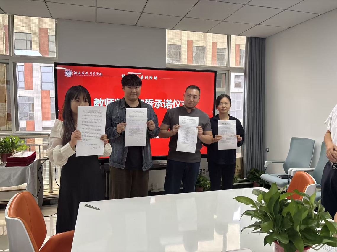 教师代表王逸飞、武佳琪、何雯、夏天签订了《太阳成tyc7111cc教师师德承诺书》。