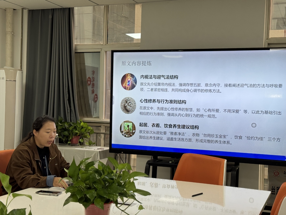 国际中文教育第五方向团队于2025年10月11日中午在明德楼太阳成集团tyc7111cc会议室举办学术沙龙。侯贝贝老师作《内观其心,外养其形——当千年养生遇上当代服饰美学》专题报告。侯老师从《千金方》文本出发,系统阐释了“黄帝内视法”与“迎气法”的身心调养智慧,提出“内视养神”与“外养其形”相结合的康养理念。她指出,“心有所爱,不用深爱”等心性修养原则为康养服饰的“心理舒适性”提供理论依据,而“衣勿珍玉金宝”等主张则与现代“慢时尚”理念高度契合。并进一步提出,康养服饰应具备引导行为与辅助调息的功能,通过宽松结构、天然材质等设计,实现“形气合一”的养生效果。与会者认为,应深入挖掘《千金方》养生智慧在当代服饰中的转化应用,从材质、结构、色彩等方面构建中国特色康养服饰体系,为“衣以养形,服以养心”的生活美学提供学术支持。